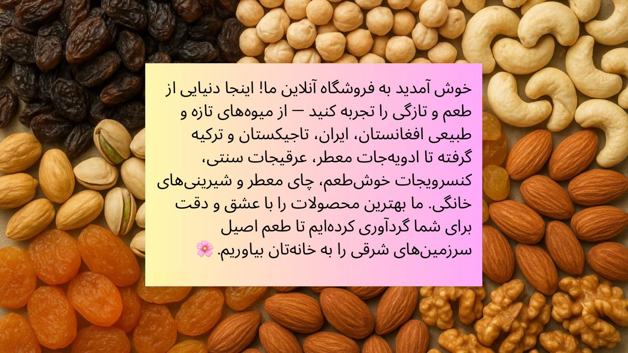 خشکبار اصیل شرقیمجموعهای از بهترین و طبیعیترین خشکبار از افغانستان، تاجیکستان، ترکیه...